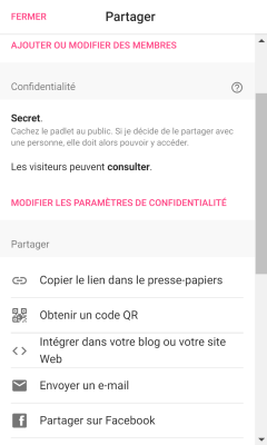 Descendez dans le volet pour choisir votre méthode de partage. Vous pouvez par exemple leur communiquer directement l'url de votre padlet. Si vous avez un ENT, vous pouvez aussi copier le code d'intégration afin que vos élèves contribuent à votre padlet sans quitter leur environnement habituel.