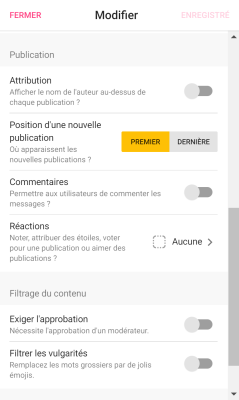 Vous pourrez ici par exemple permettre ou non à vos élèves de commenter et/ou de réagir aux posts des autres (avec des étoiles par exemple) et soumettre les contributions à votre validation avant leur publication.